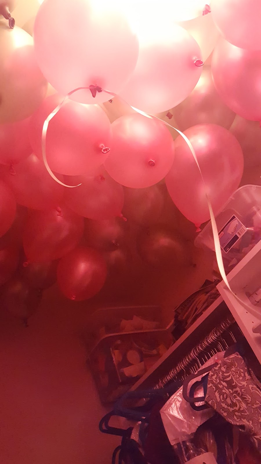 It took the two of us roughly 5-6 hours to finish the whole project. When complete, the entire ceiling had 3-4 layers on balloons. With the ceiling lights, the light shined through and gave the whole place a fun pinkish tint.
